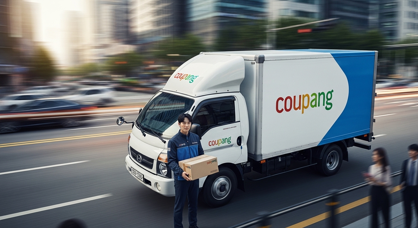 쿠팡의 로켓배송 시스템과 빠른 배송을 상징하는 모습